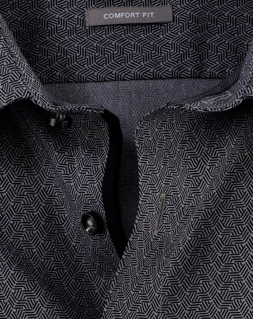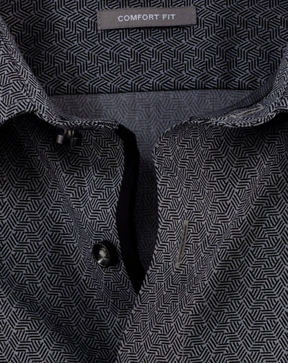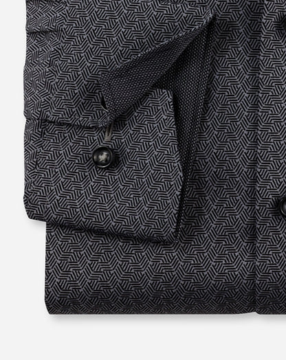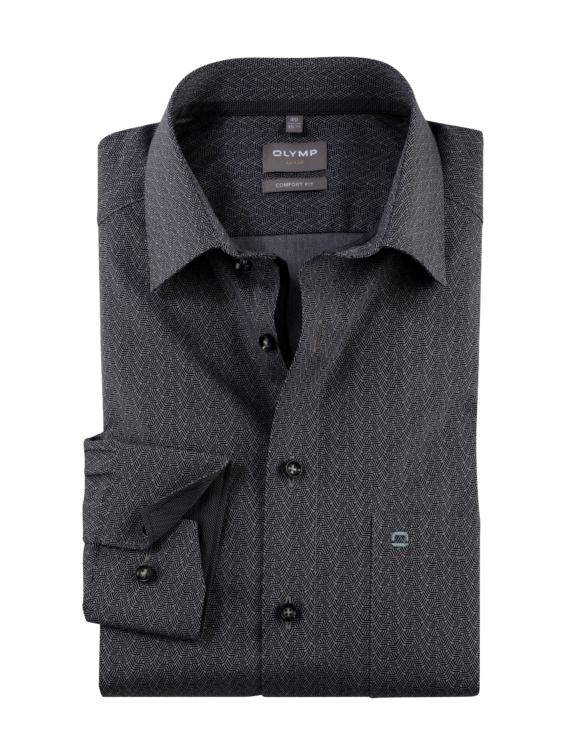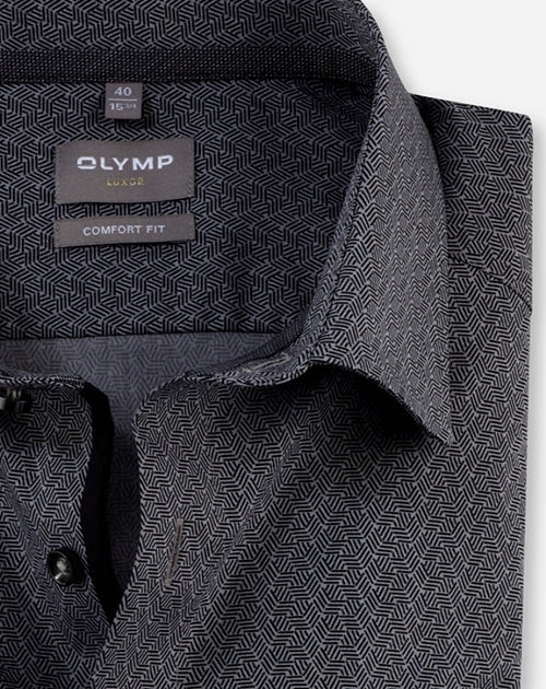 Graphic minimal print in tonal colors made from fine yarns - a straight-lined OLYMP Luxor comfort fit business shirt in a wide range of colors. The texture made from pure cotton feels pleasantly cool on the skin and is easy to care for, saving time. Completed with versatile New Kent and contrasting textured trim on the inside. Elegant in black.