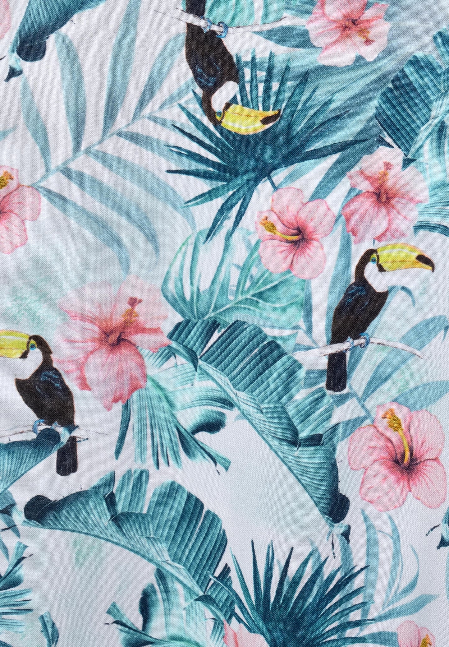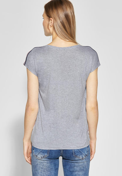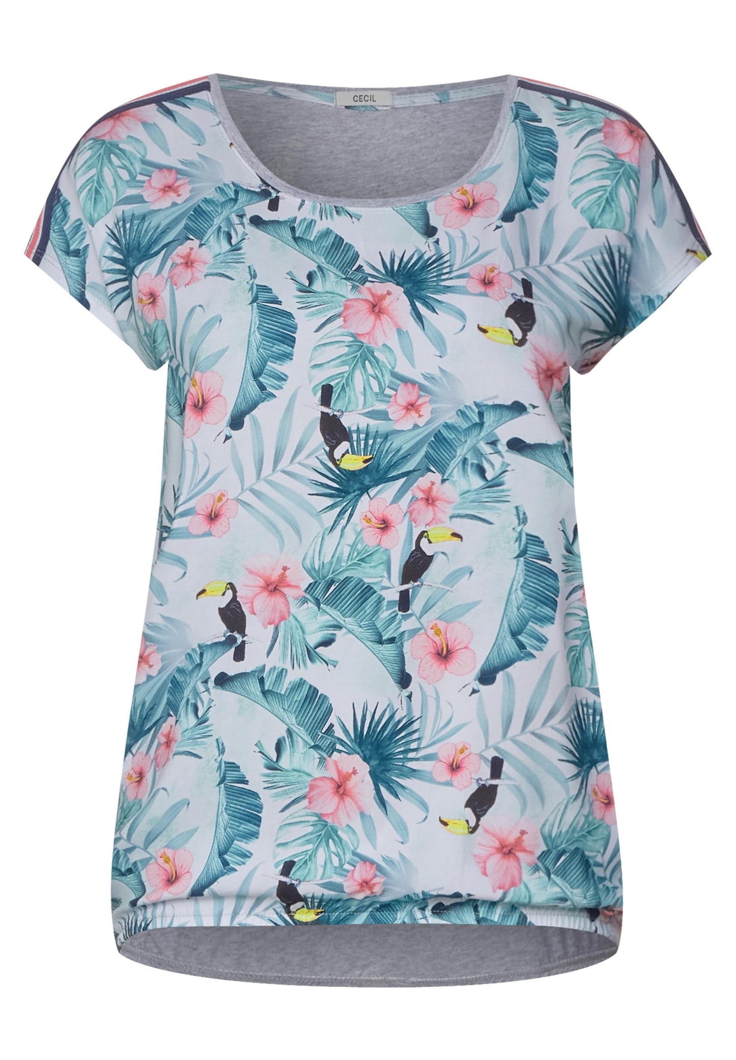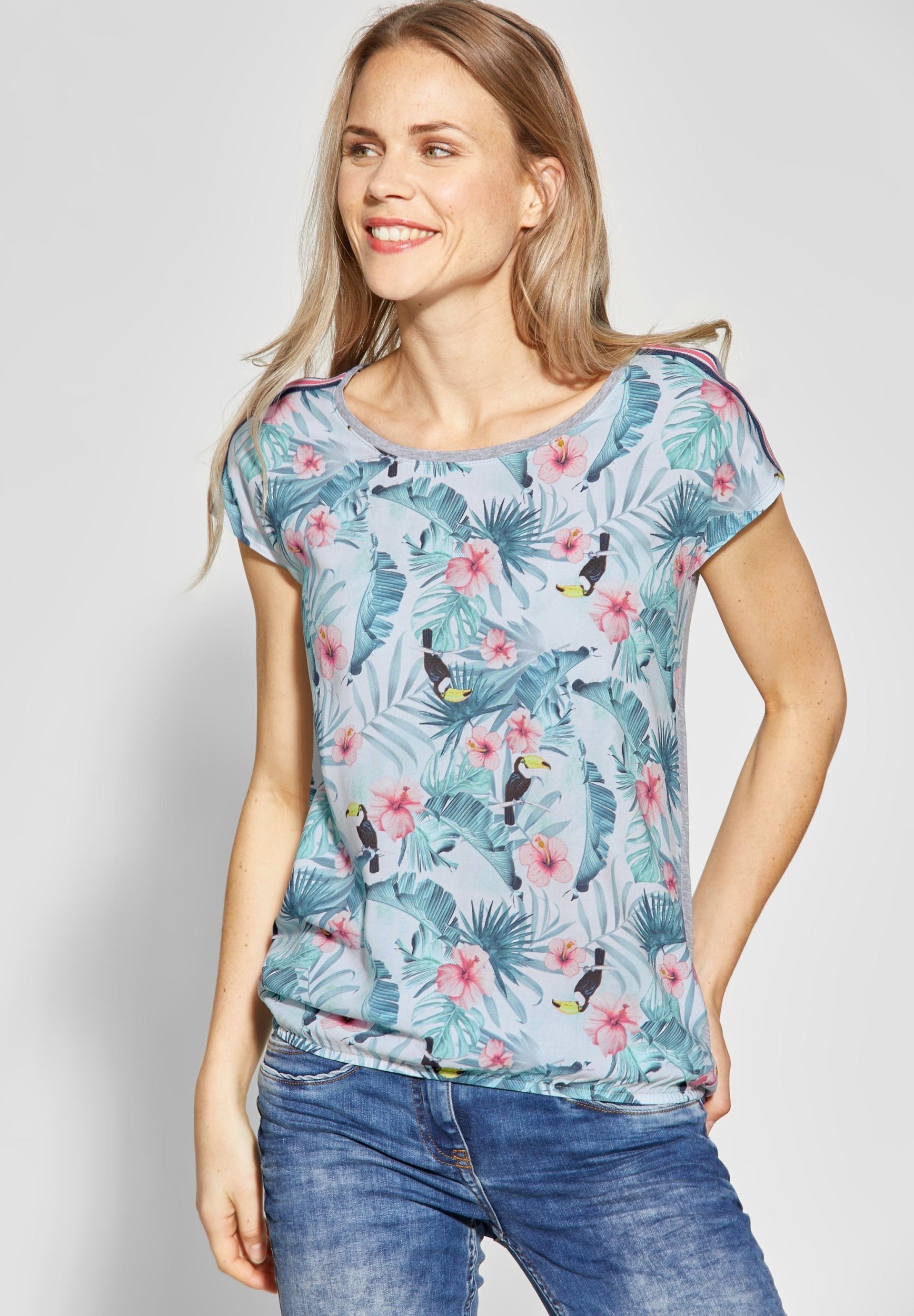 Favorite shirt in summer! The tropical print gives every outfit variety and great color highlights. The short sleeves on the dropped shoulders are emphasized by the college-style stripes and provide a sporty touch. The back part is kept simple and impresses with its melange look. The design is rounded off by the elastic hem and the round neckline.