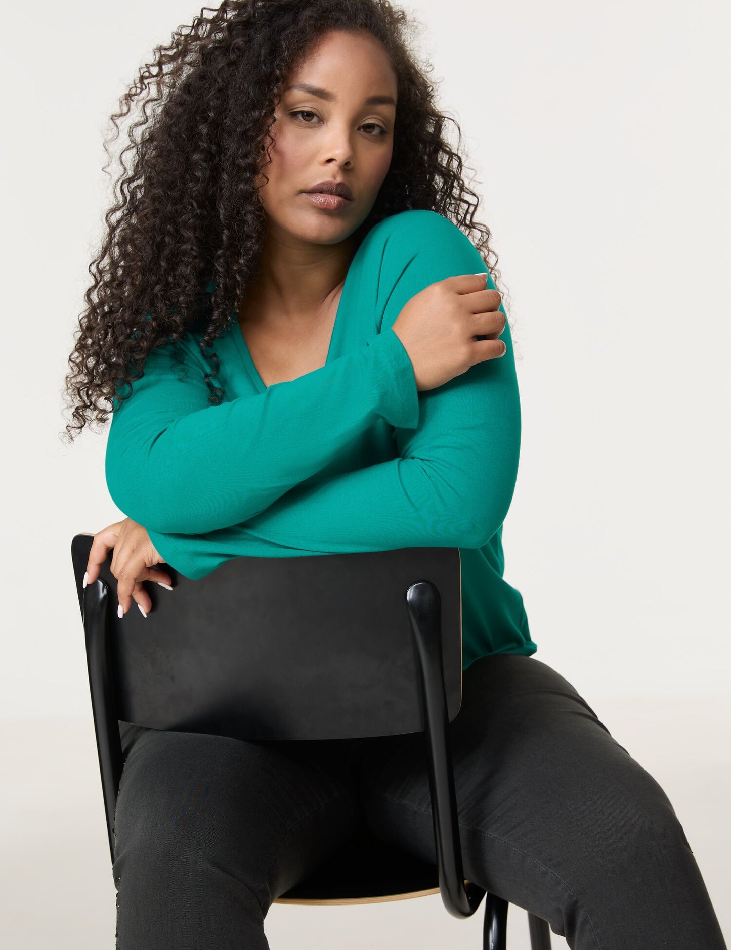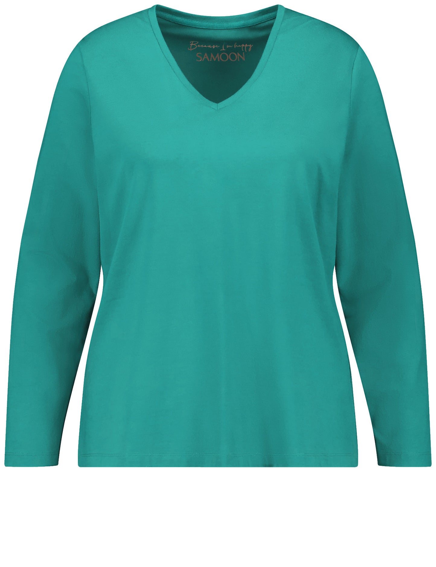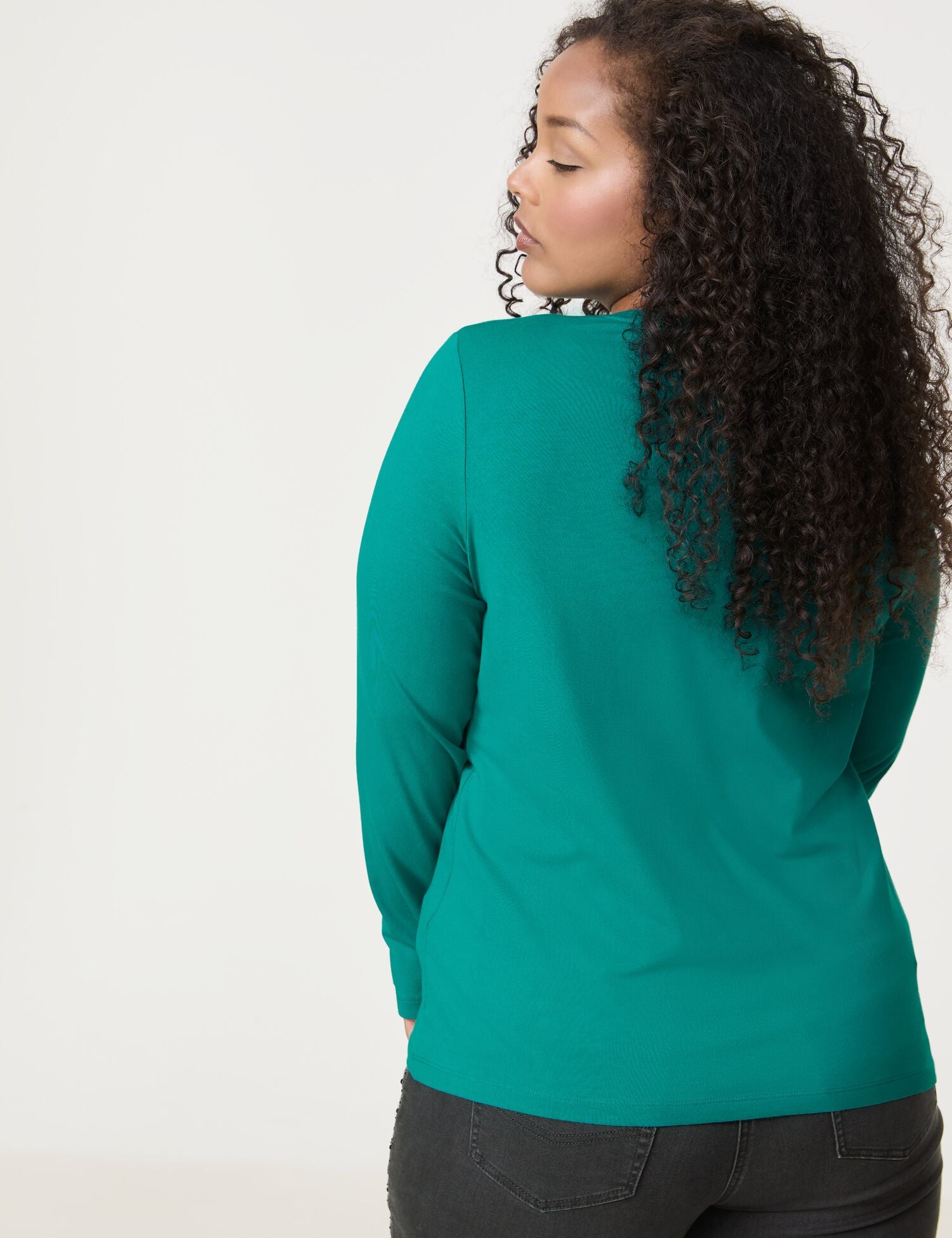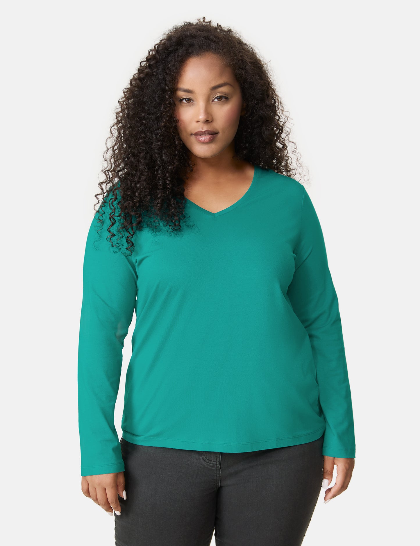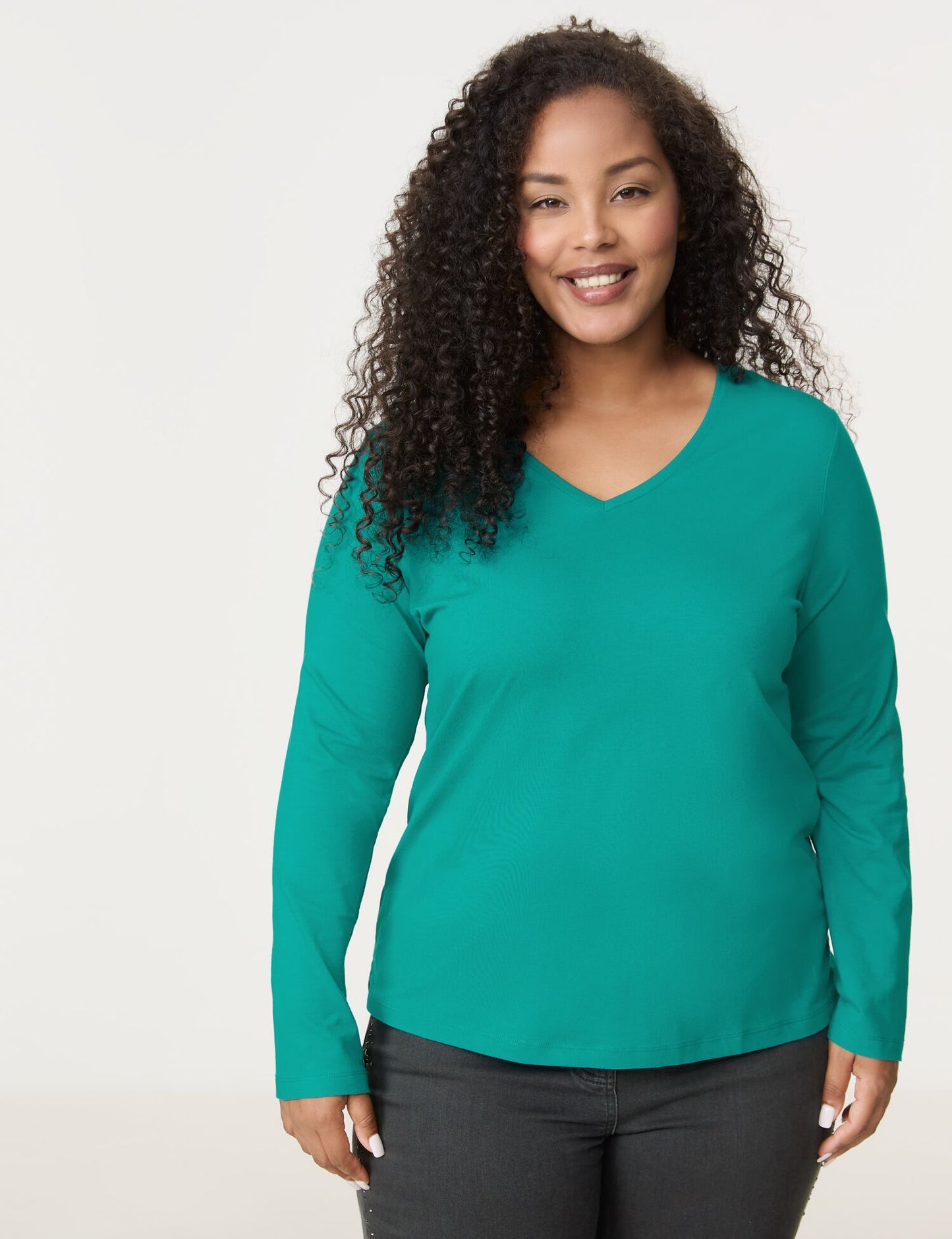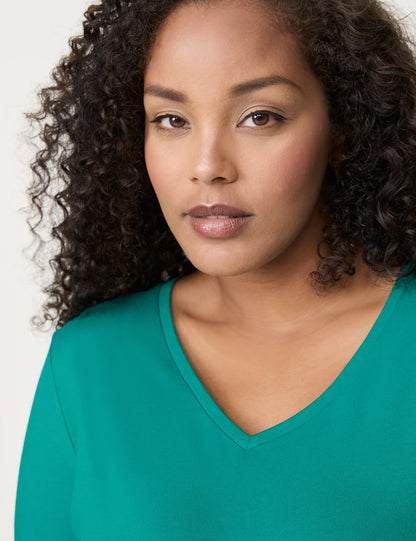 Ribbed trim at the neckline. Your wardrobe essential: The figure-hugging basic shirt with a rounded V-neck is the perfect basis for numerous styling options and pampers your skin. Wear it alone with your favorite jeans for a relaxed look or under a blazer for a chic office look. A versatile must-have that no closet should be without.