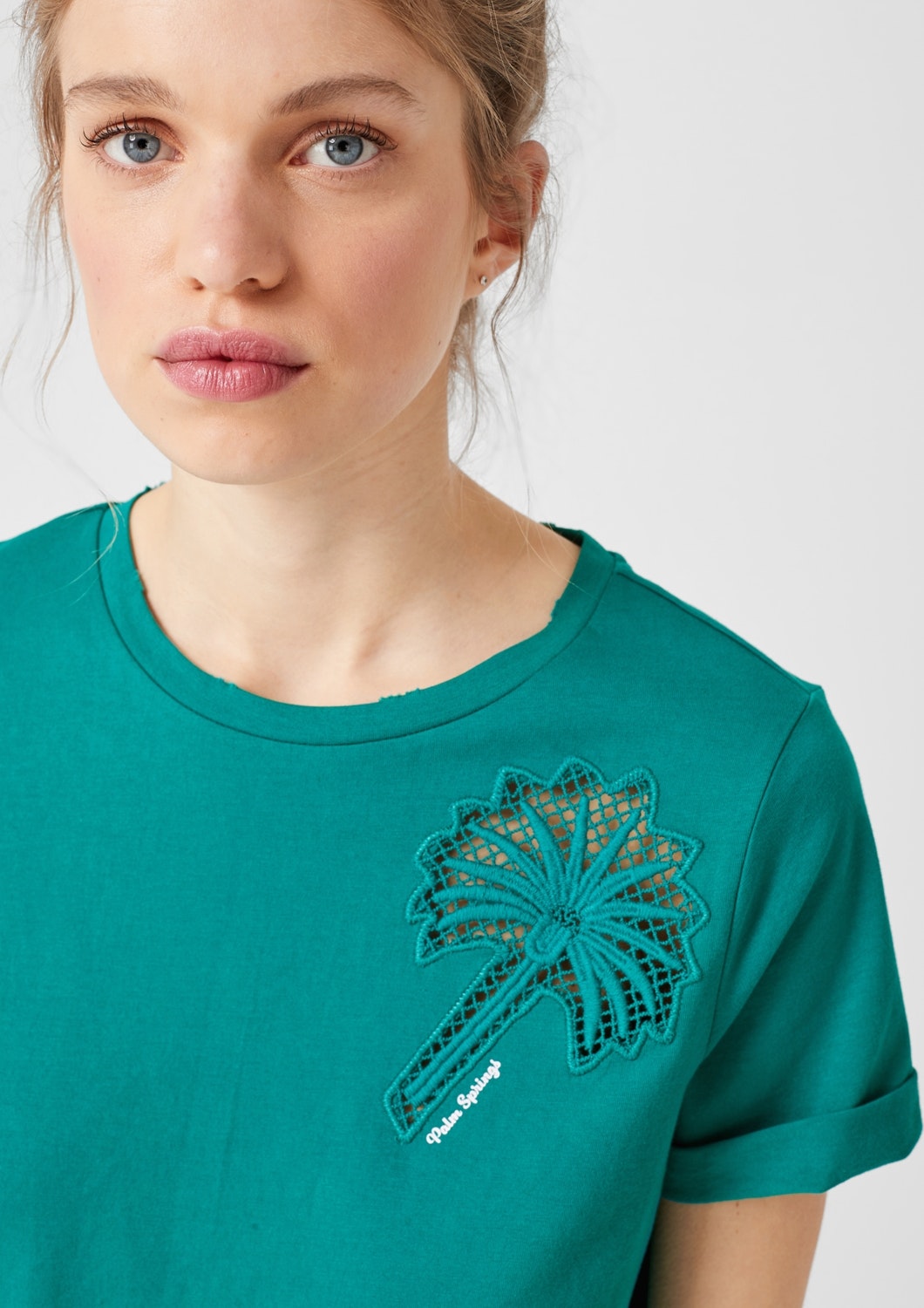 inserted embroidery in the shape of a palm tree on the front, round neck with fine ribbed trim in a used look, sleeves with fixed cuffs, regular fit; Back length for size S approx. 60 cm, jersey made of pure cotton