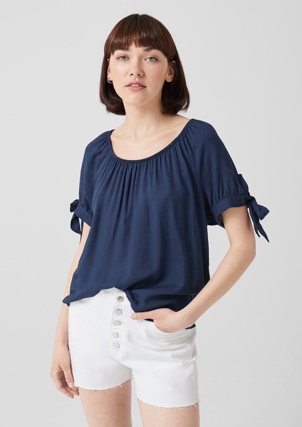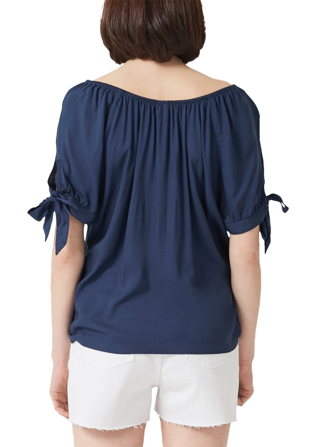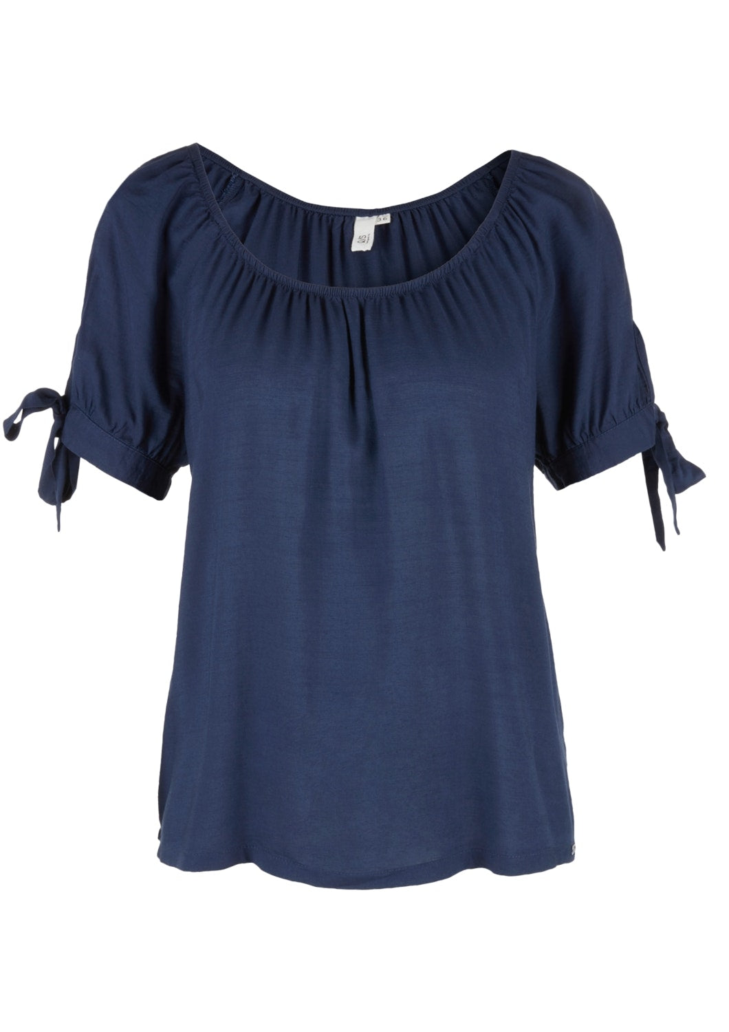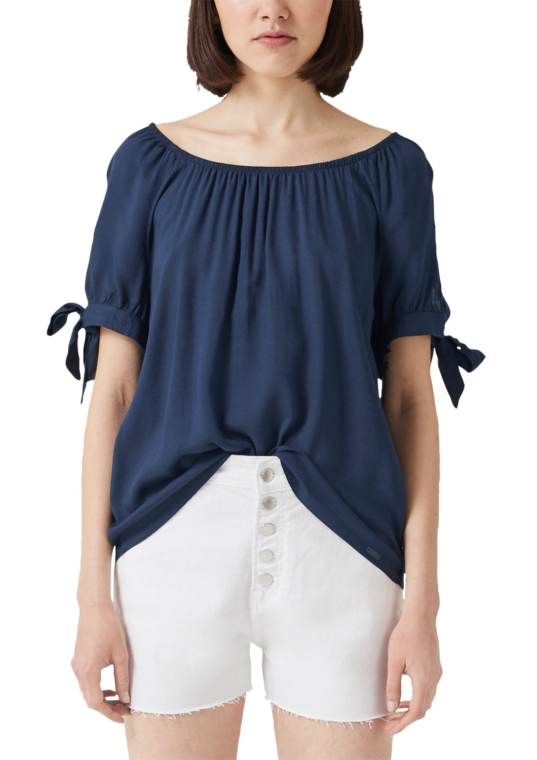 feminine blouse shirt made of slub yarn woven fabric, wide, gathered neckline with elastic band, short raglan sleeves with placket and bow detail, flared, loose A-shape; Back length for size 36 approx. 52 cm, flowing slub yarn quality made of soft viscose