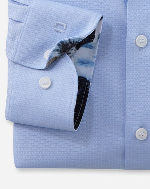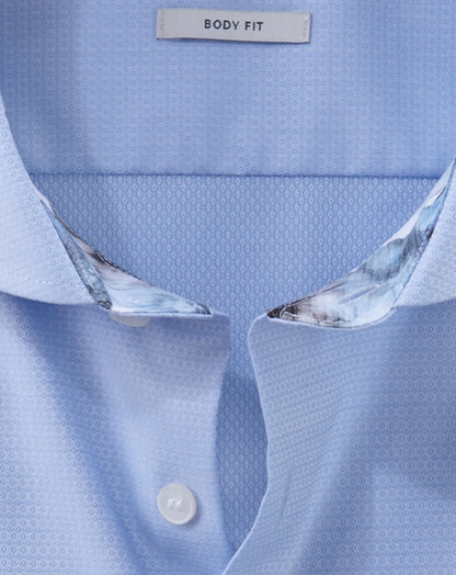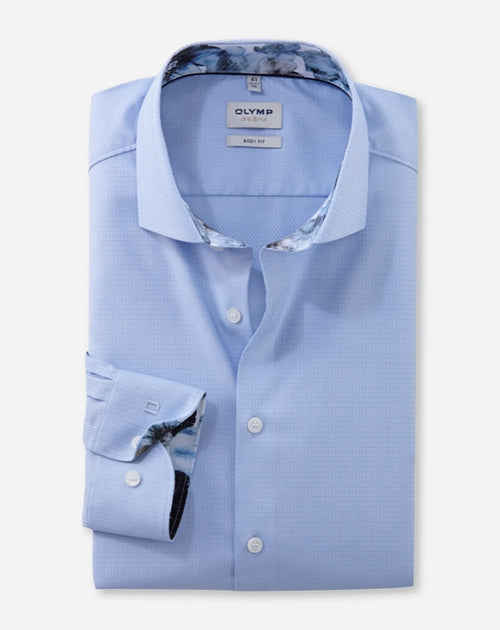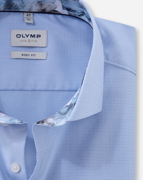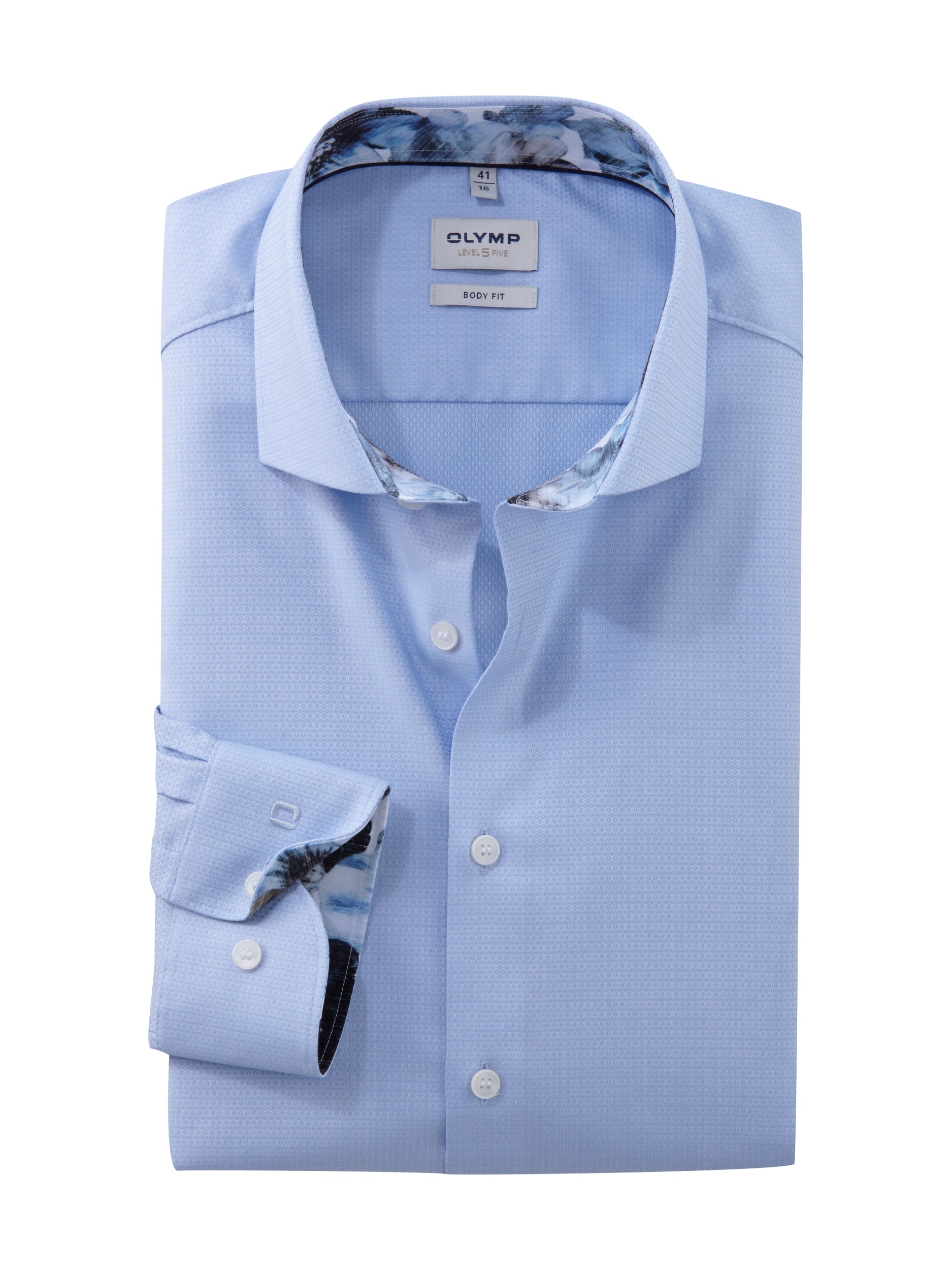 Ein Klassiker in Bleu mit modischen Details ? das OLYMP Level Five body fit begeistert mit fantasievollem Print im markanten Royal-Kent-Kragen und gerundetem Saum. Die sportaffine, körperbetonte Linie verbindet Qualität, Style und Tragekomfort im jungen Business-Segment. Der bewährte Comfort Stretch ist hautsympathisch, formstabil und bügelleicht.
