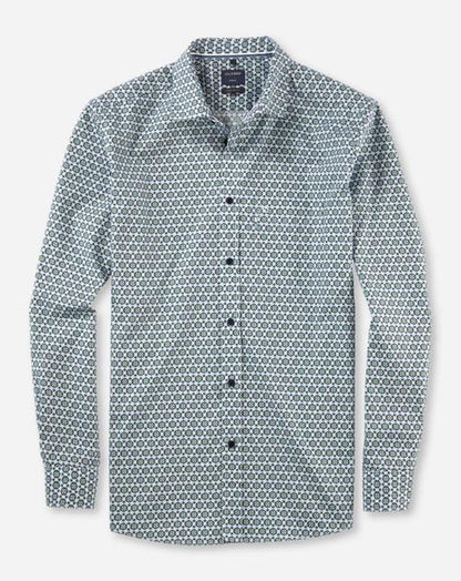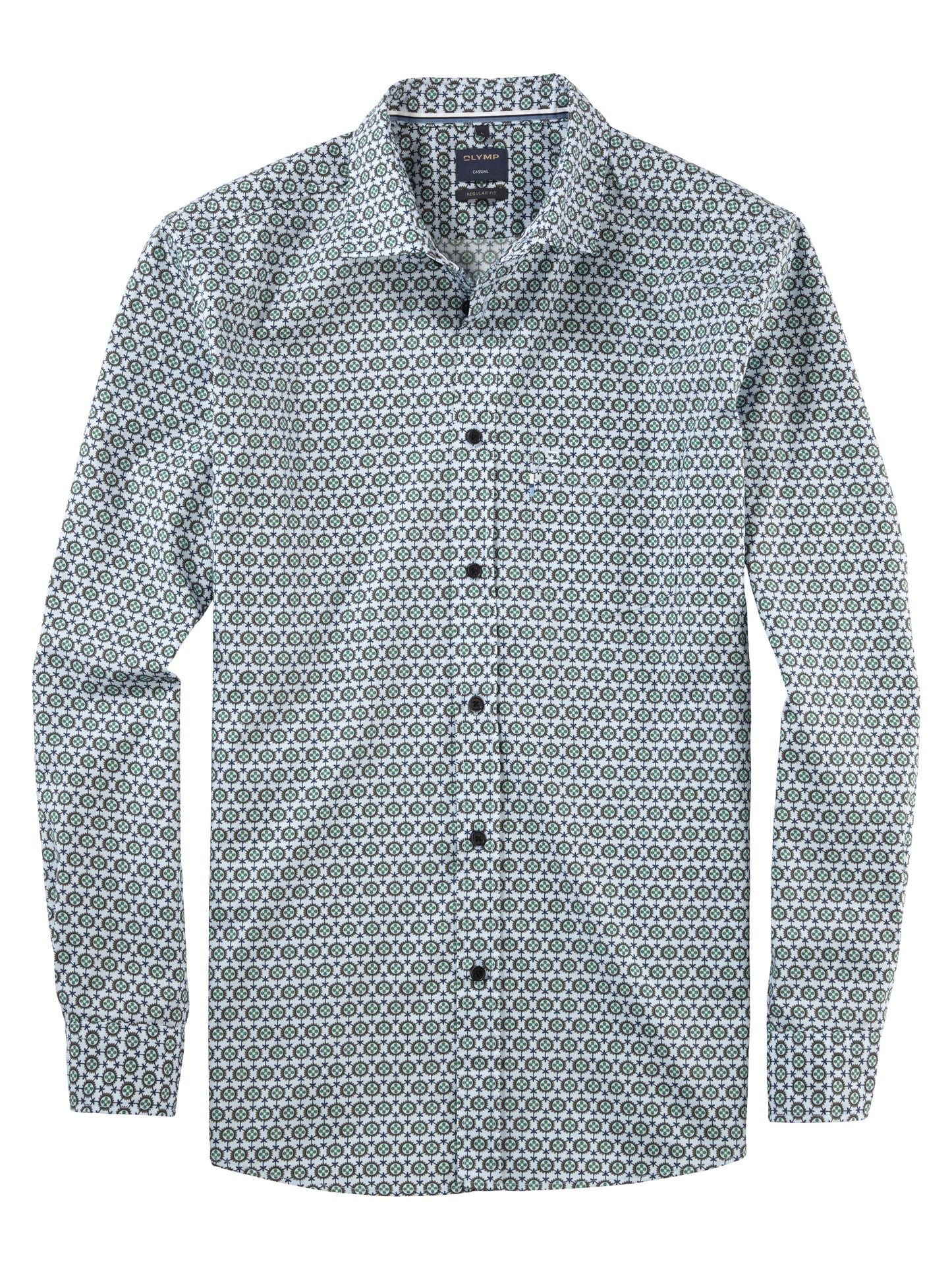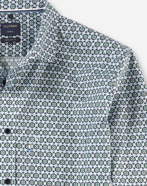 Bereit für das Frühjahr mit diesem OLYMP Casual aus feinem Baumwoll-Twill. Das Hemd ist in lässigem Regular-Fit geschnitten und mit raffinierten Colour-Print gestaltet. Es unterstreicht die entspannte maskuline Performance mit klassischem Kent und leicht gerundetem Saum. Hautsympathischer Tragekomfort, natürliche Dehnbarkeit, pflege- und bügelleicht.