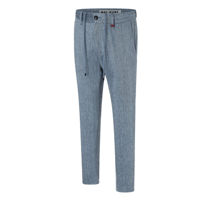 Modern Fit schmales, gerades Bein gemäßigte Leibhöhe Chino seitliche Eingrifftaschen vorne Paspeltaschen hinten Tunnelzug am Bund Linen Stretch französischer Leinen-Look elastische Qualität edler Glanz fließende, weiche Optik leicht im Gewicht hoher Tragekomfort Materialmix mit FSC-zertifizierter Viskose Das Model ist 1,85m groß und trägt die MAC Bundweite 33 und Länge 32 Fußweite bei Größe 33: 34cm