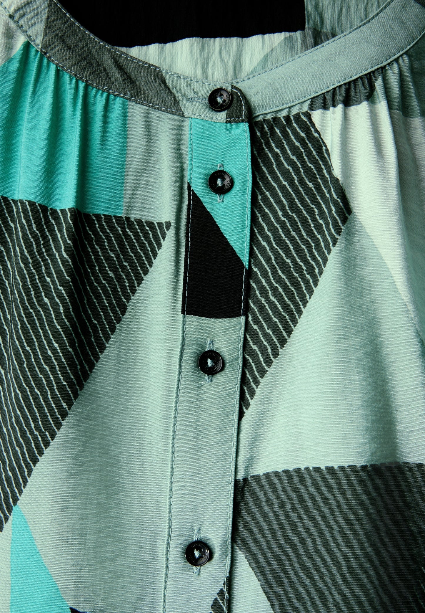 Die grafisch gemusterte Bluse von CECIL für Damen punktet mit einem Rundhalsausschnitt sowie langen Ärmeln mit Bündchen. Der angenehme Viskose-Mix sorgt für optimalen Tragekomfort und der gerundete Saum rundet den Look perfekt ab. Damenbluse mit Rundhals Knopfleiste Langarm mit elastischem Bündchen Geometrischer Print Angenehmer Viskose-Mix Material: 88% Viskose, 12% Nylon